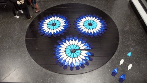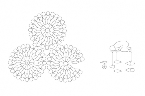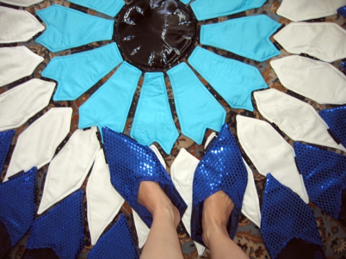 Inspired by the geometric motifs of Islamic art, the Flocking Mosque juxtaposes these patterns with the five daily prayers of quotidien Muslim life. One “flower-circle” of this mosque can accommodate a prayer of twelve worshippers, by providing clean surfaces for those body parts that touch the ground during the prayer ritual. Each flower-circle consists of twelve pairs of slippers, twelve pairs of hand pillows, twelve head pillows, and a center bag with twelve prayer beads. The use of these pillows as “mini-prayer-rugs” is meant to create a visual analogy to religious rules of behavior, which in turn mystically represent the Islamic doctrine of unity in multiplicity, the al-Tawhid.