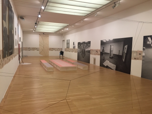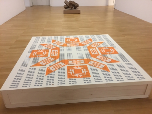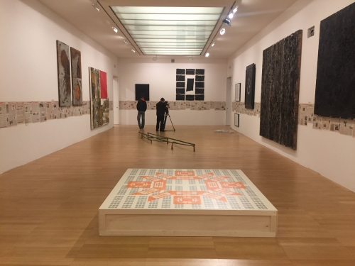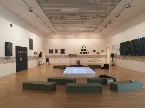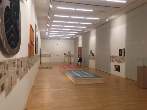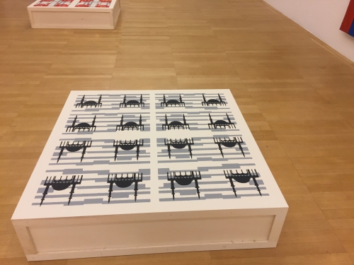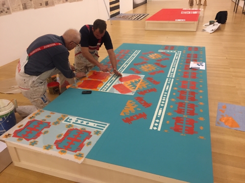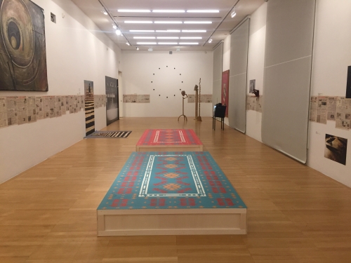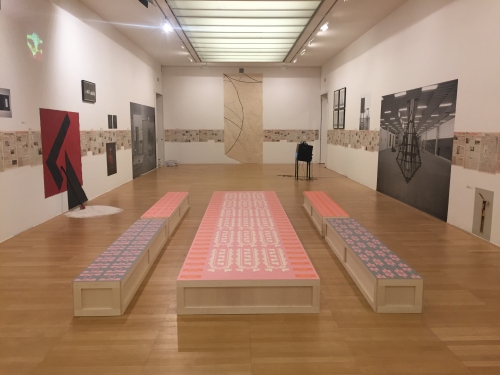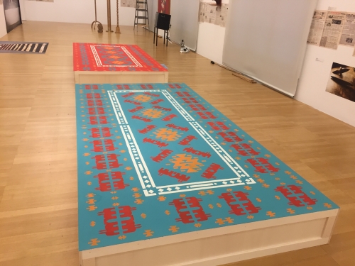 Palimpsest of ’89 is an artistic installation exploring the role of Sarajevo’s cultural institutions in shaping the common heritage of Yugoslavia. The project was produced for The Heritage of 1989 exhibition at the Museum of Modern Art (Moderna galerija) Ljubljana, which reenacted the Second Yugoslav Documents, the largest retrospective of Yugoslav art before the 1990s Yugoslav breakup. Palimpsest of ’89 visualizes how the region’s history has been “written and rewritten” through the work of institutions that have been framing and preserving the common heritage. The installation is conceived both as exhibition furniture and as a conceptual structuring format that organizes the exhibition through specific historical contexts. The first idea translates into the exhibition space using museum shipping crates, representing the museum as an institution that preserves cultural memory and frames common heritage. The second idea is articulated by a “palimpsestual carpet,” proposing a model for thinking about the creation of the common heritage through the weaving of integrative and disintegrative narratives and policies related to cultural institutions. Taken together, these two ideas inform the design of the exhibition architecture in the form of museum shipping boxes painted with carpet patterns that provide the historical context for the interpretation of artworks on display.