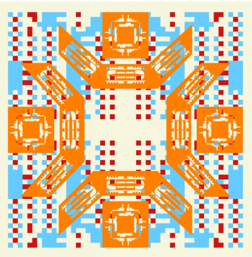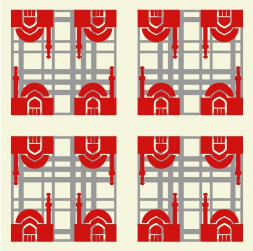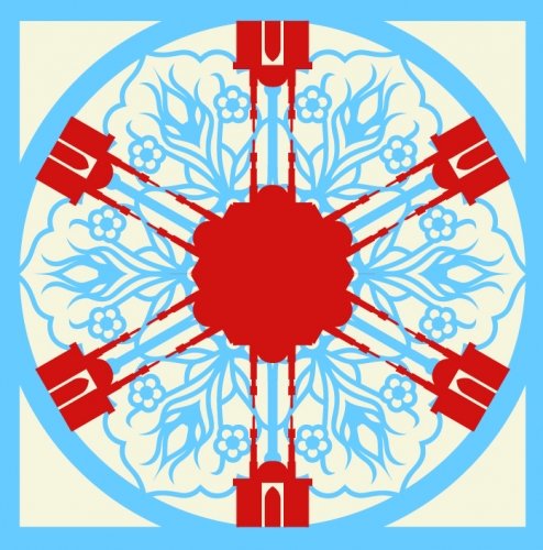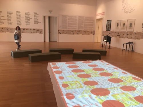 Carpet iconography functions like a form of storytelling and history writing. The carpet patterns of this piece depict the creation of the common heritage through selected cultural institutions that were founded in each period of Sarajevo’s history: 1. The Pre-Modern (Pre-Ottoman and Ottoman), 2. The Modern / Austro-Hungarian, 3. The Modern / Socialist, and 4. The Post-Dayton Period (1995–2016). Each of these periods translates into one layer of the palimpsestual carpet, and with each room, more and more symbols are added to the carpet, while others get revised or erased. The largest, central space of the exhibition focuses on the period of the War of 1992–95 as well as on the now, represented through an analog / digital carpet in the center of the space. This carpet brings together the constantly changing digital animation of all patterns from all exhibition rooms with the real-time crisis of the common heritage of today and of the future.